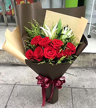白+粉百合6朵,30支紅色扶郎花,10支粉色扶郎花,16支黃色扶郎花,黃鶯,散尾葵等豐滿搭配。