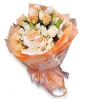 5朵白百合,35朵鮮花(太陽花,白玫瑰,康乃馨),散尾葵豐滿搭配。